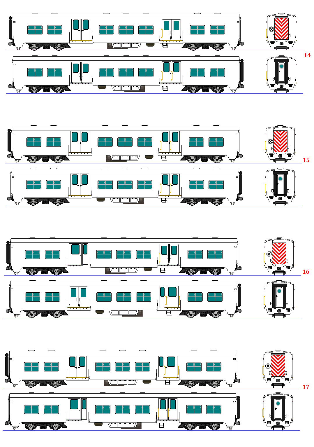 17: Variante con ventanillas antivandálicas de calidad superior, fuelles de tubos de goma tipo bourrelet/burriele, puertas corredizas reemplazadas por puertas rebatibles con apertura hacia el interior (Lado no correspondiente al furgón, y con una saliente, debido a la diferencia entre los perfiles rectos de las nuevas puertas, y el perfil curvo del coche, además de agregarse una pequeña plataforma para que no haya tanta distancia entre coche y andén), escalerillas eliminadas (se agregó una escalera colgante angosta para casos de emergencia, pero hay una en cada lateral, hacia las puertas del lado derecho), nueva saliente y pequeña plataforma en las nueva puerta ancha de una sola hoja, acompañada de un vidrio en una falsa puerta fija (lado furgón), siendo la puerta ancha, rebatible hacia adentro, fuelle eliminado y reemplazado por una chapa metálica con cebrado alternado en colores blanco y rojo, en V, a 90º (Lado furgón). Se desconoce si hay unidades con esta variante.